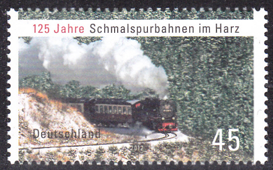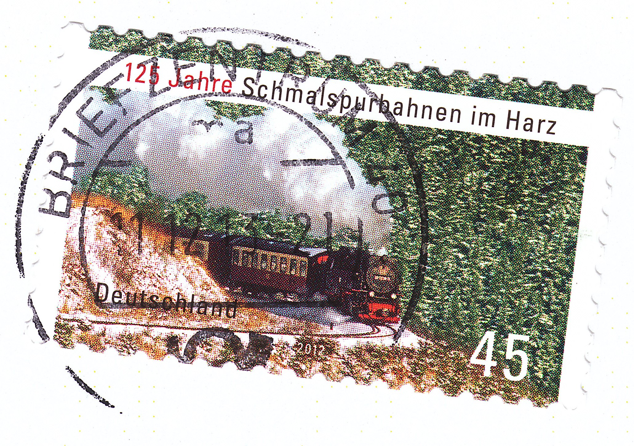 Aus Anlaß des Jubiläums "125 Jahre Schmalspurbahnen im Harz" erschien diese Sondermarke, hier als portorichtige Einzelfrankatur auf einer Postkarte, entwertet am "11.12.13":