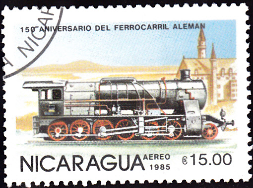 In Nicaragua ist auch eine Markenserie zum Thema "150 Jahre Deutsche Eisenbahn" erschienen. Hier eine Marke (MiNr 2579) mit einer Dampflokomotive (Oldenburgische G 1).