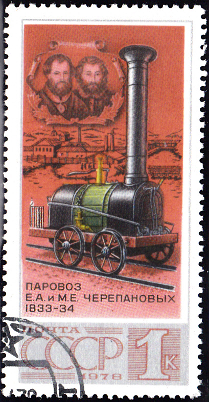 Auf dieser Marke der Sowjetunion (MiNr 4715) aus einer Serie "Dampflokomotiven" wird die erste Dampflokomotive in Russland, mit einer Nutzlast von 3,3 Tonnen und einer maximalen Geschwindigkeit von 13 bis 16 km/h gezeigt. Sie wurde von Jefim Alexejewitsch Tscherepanow (geb. 1774; gest. 1842) und seinem Sohn Miron Jefimowitsch Tscherepanow (geb. 1803; gest. 1849; russische Erfinder und Maschineningenieure) gebaut.