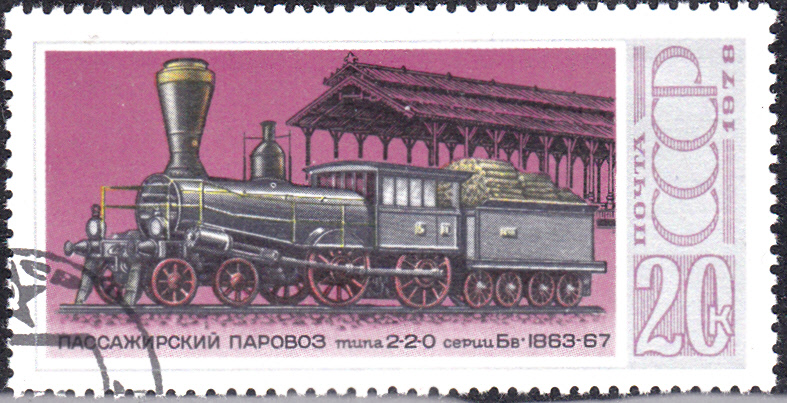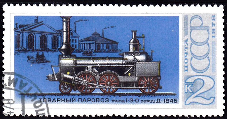 Aus der gleichen Serie kommt diese Marke der Sowjetunion (MiNr 4716) mit einer Güterzuglokomotive 1-3-0 D aus dem Jahre 1845.