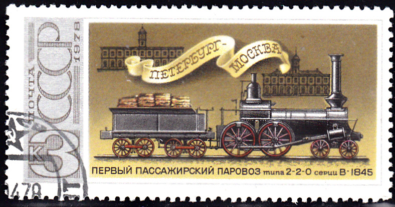 Die nächste Marke (MiNr 4717) zeigt eine Personenzuglokomotive 2-2-0 V (1845) und im Hintergrund Bahnhöfe von Sankt Petersburg und Moskau.