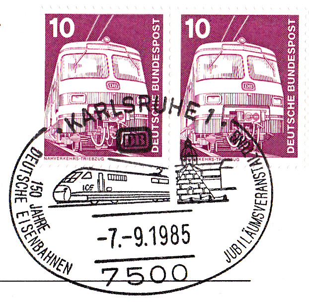 Sonderstempel vom 7.9.1985 aus Karlsruhe zu einer Jubiläumsveranstaltung "150 Jahre Deutsche Eisenbahn".