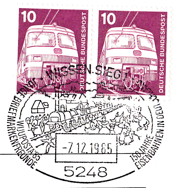 Sonderstempel vom 7.12.1985 aus Wissen zu einer Briefmarkenausstellung und zu "150 Jahre Deutsche Eisenbahn". Im Stempelbild eine Abbildung zur ersten Fahrt der Lokomotive "Adler".