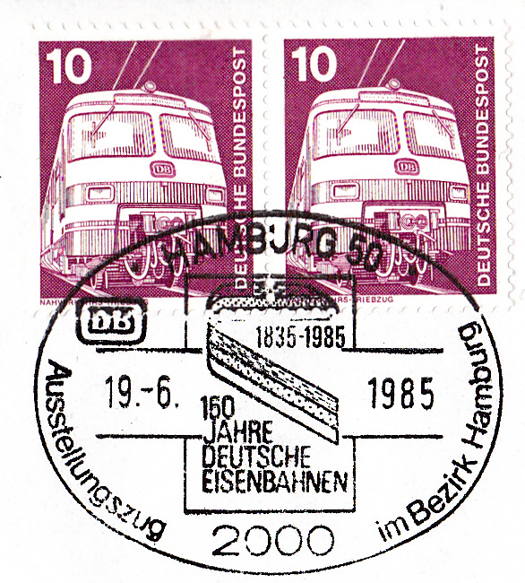 In diesem Sonderstempel vom 19.6.1985 aus Hamburg ist das Signet "150 Jahre Deutsche Eisennbahn" zu sehen.