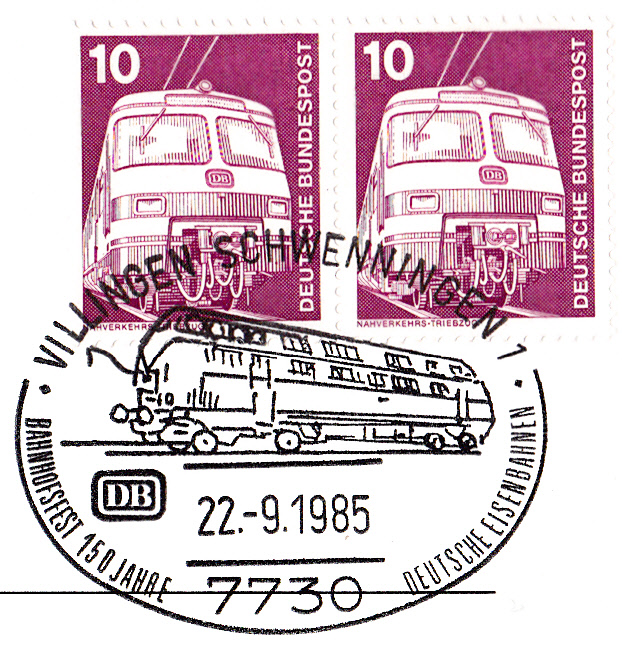 Zum Bahnhofsfest aus Anlass "150 Jahre Deutsche Eisenbahn" gab es am 22.9.1985 in Villingen-Schwenningen diesen Sonderstempel mit einer Diesellokomotive.