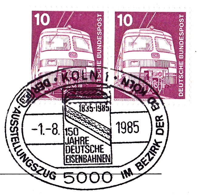 Dieser Sonderstempel vom 1.8.1985 aus Köln zeigt wie der bereist gezeigte SST aus Hamburg das Signet "150 Jahre Deutsche Eisennbahn" und weist auf den "Ausstellungszug" hin.