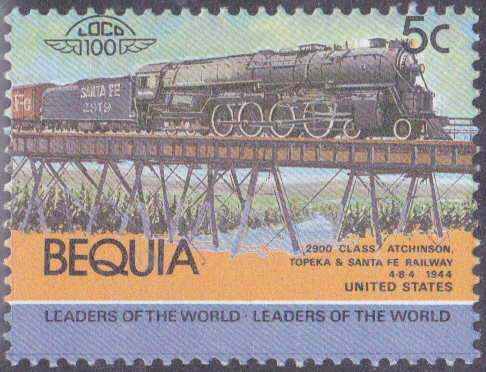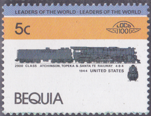 Auf dieser Marke aus Vincent Grenadinen, Bequia (MiNr 1) (die Insel Bequia ist Teil des Staates St. Vincent und die Grenadinen mit etwa 5000 Einwohner und einer Fläche von ungefähr 18 km²) ist eine Aufrisszeichnung einer Dampflokomotive der Challenger-Klasse der Union Pacific Railroad aus dem Jahre 1942 abgebildet.