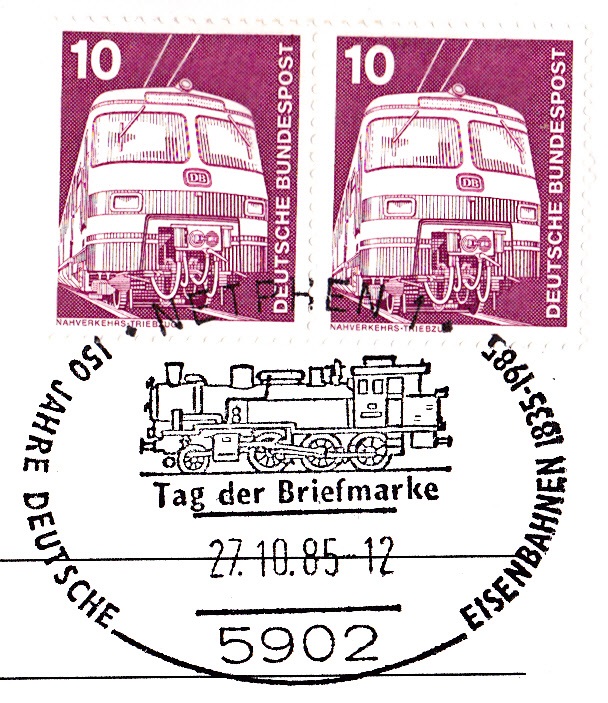 Sonderstempel vom 27.10.1985 aus Netphen 1 zum Jubiläum "150 Jahre Deutsche Eisenbahn" und zum Zag der Briefmarke. Im Stempel wird eine Dampflokomotive gezeigt.