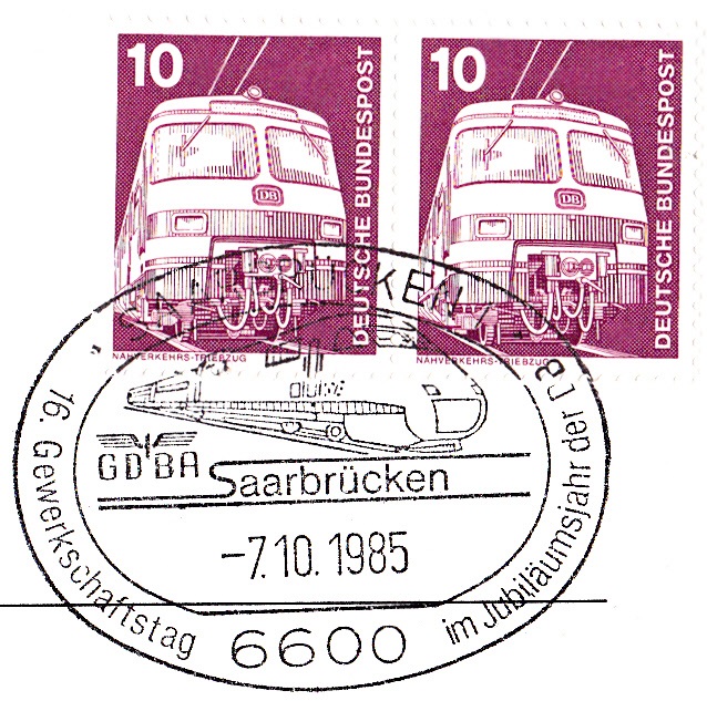 Im Sonderstempel vom 29.6.1985 aus Dillingen zu "150 Jahre Deutsche Eisenbahn" und "125 Jahre Saarstrecke" wurde im Stempel die gleiche Abbildung gezeigt wie im vorigen Stempel aus Saarbrücken.