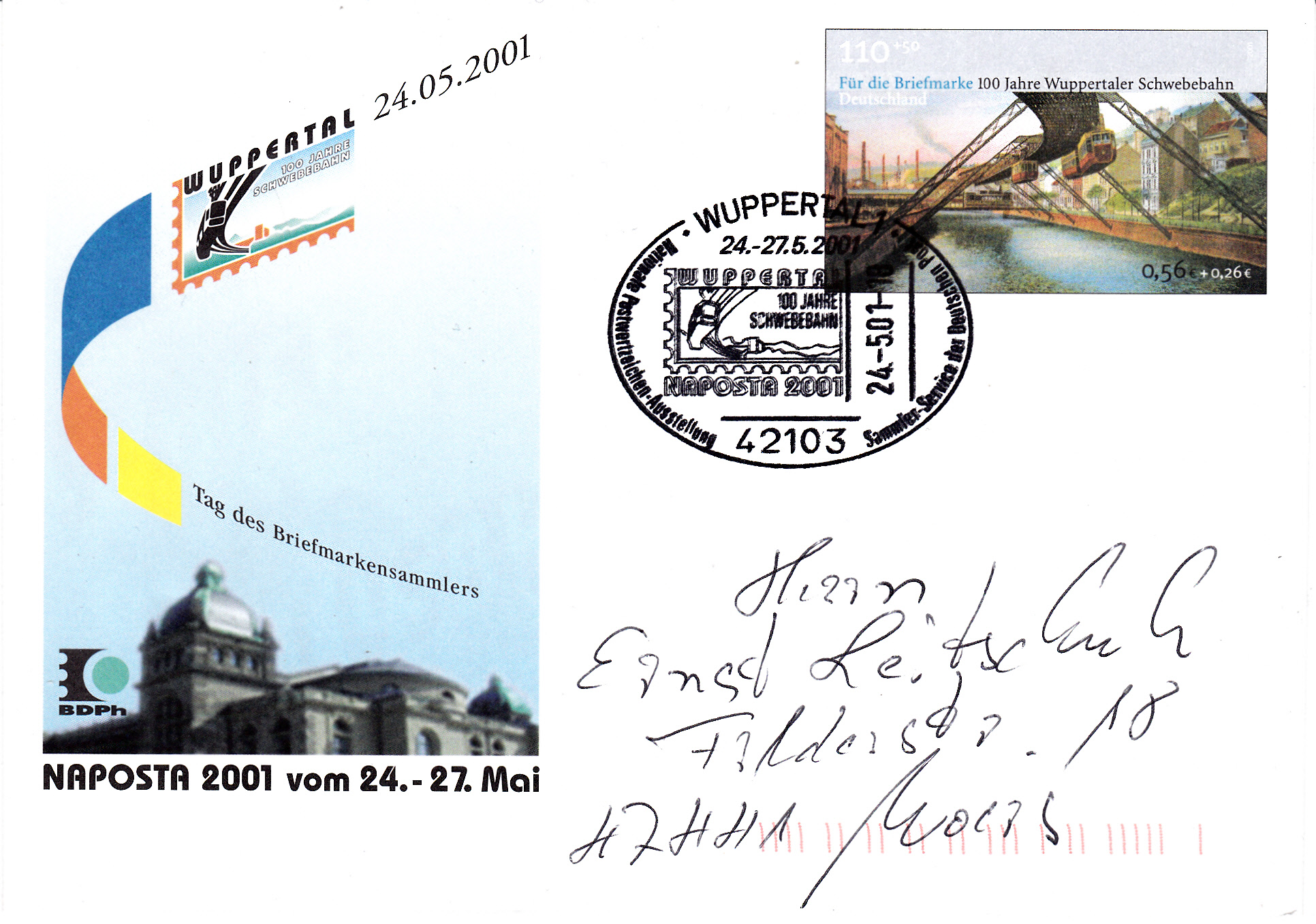 Sonderganzsache zur NAPOSTA 2001 (MiNr USo 28) mit Wertstempel Wuppertaler Schwebebahn (MiNr 2171) und dem dazu passenden Sonderstempel zur Nationalen Postwertzeichenausstellung in Wuppertal vom 24.5.2001.