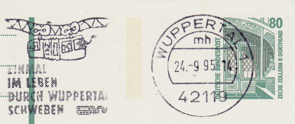 Maschinenstempel aus Wuppertal 1 vom 24.9.1995 Kennbuchstaben "mh" mit dem Werbeeinsatz "Einmal im Leben durch Wuppertal schweben"