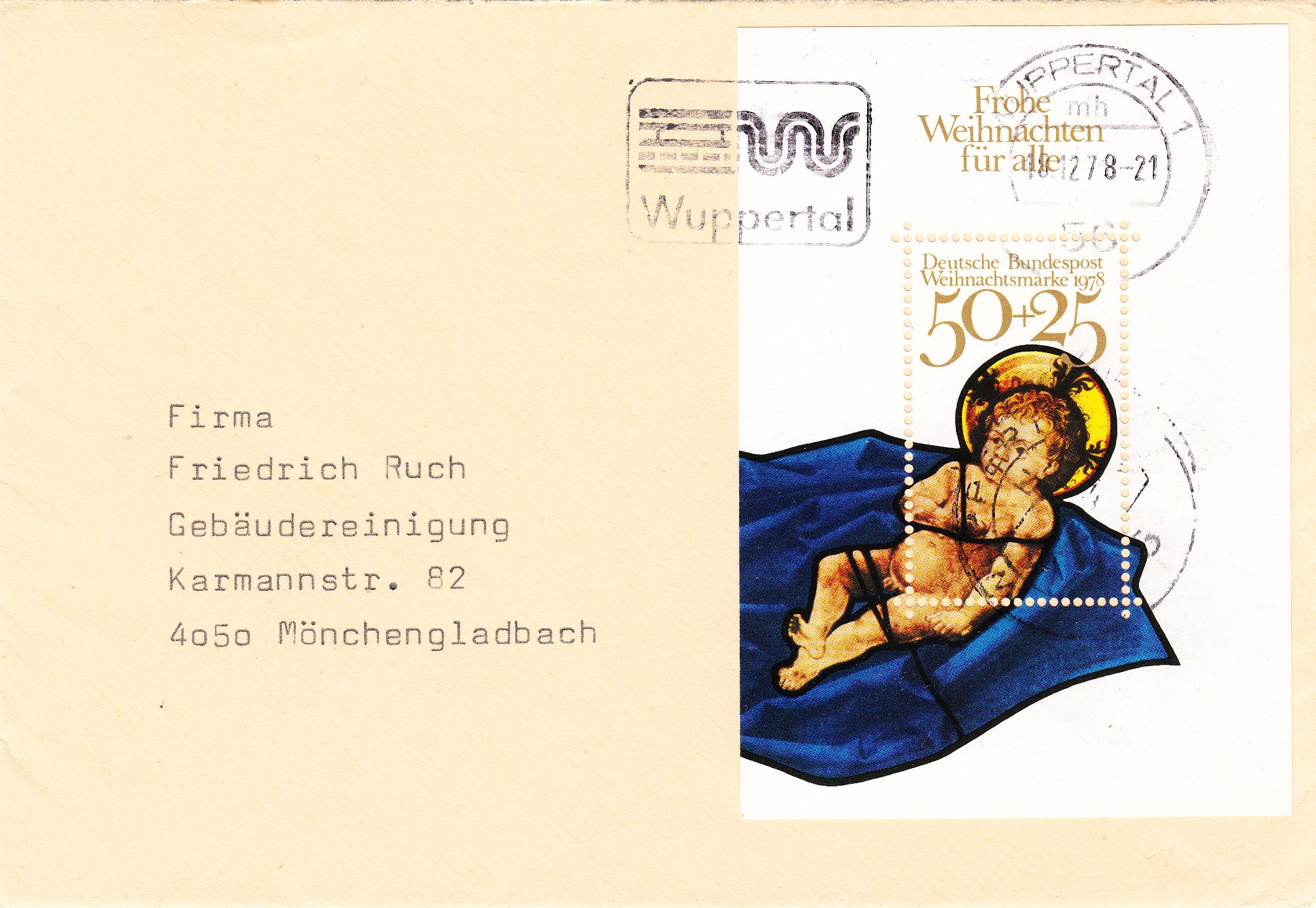Hier der von wajdz bereits gezeigte Maschinenstempel "mh" aus dem Jahre 1978 auf einem hübschen Bedarfsbeleg vom 18.12.1978, der einen Weihnachtsgruß enthalten haben dürfte: