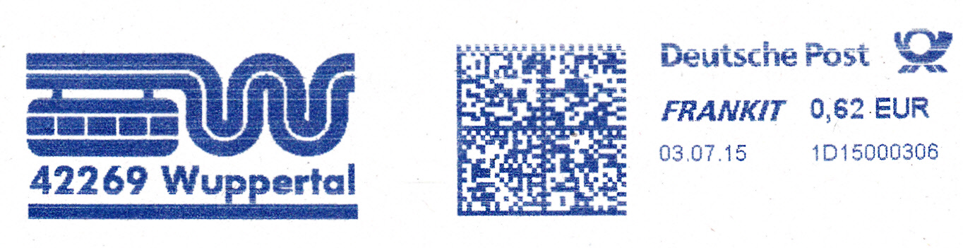 Dieser Frankaturstempel FRANKIT stammt von einer Maschine des Typs "15" mit der Kennung "000306" = 774 der Herstellers "1D" = Neopost und zeigt die stilisierte Wuppertaler Schwebebahn: