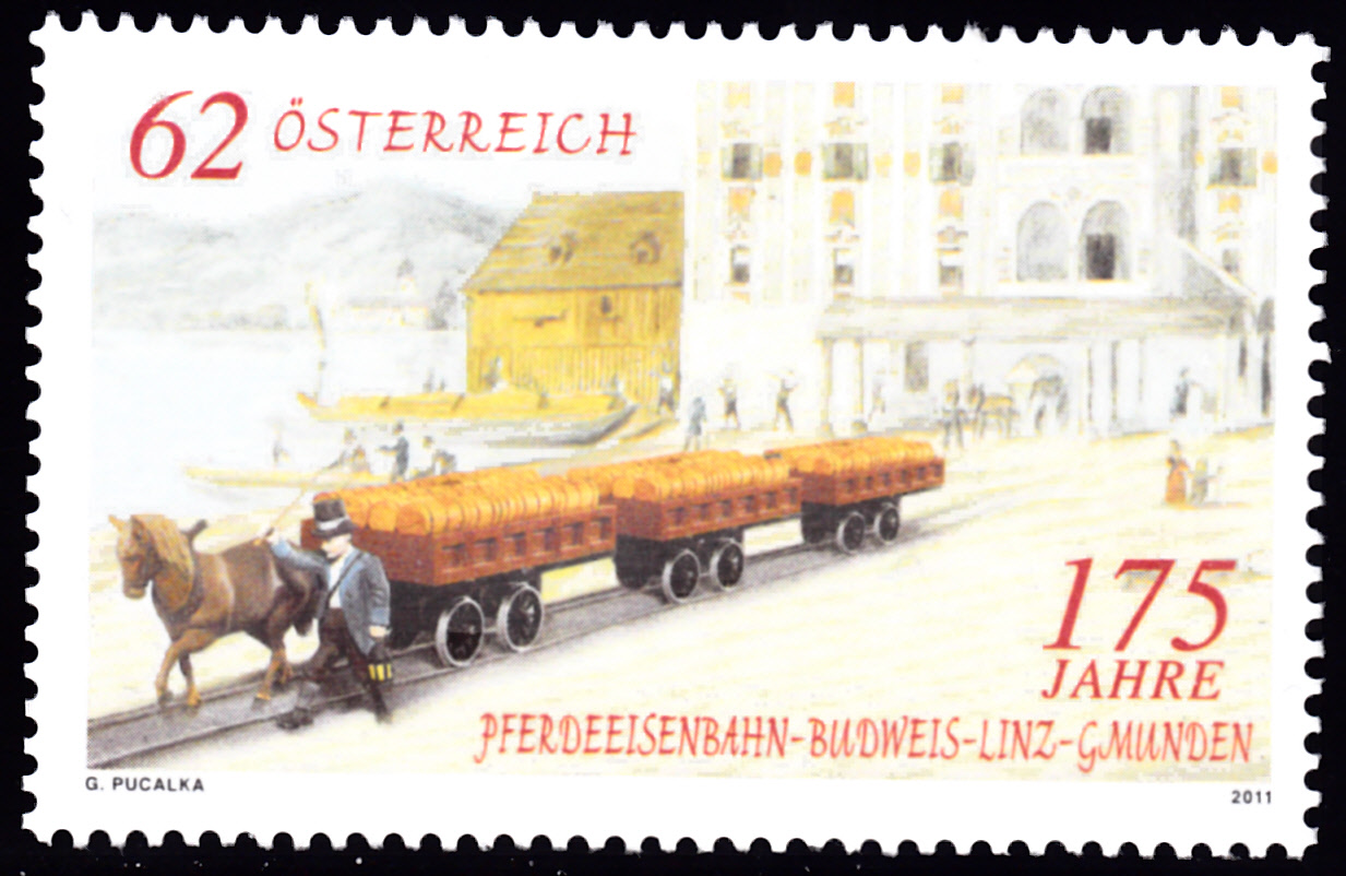 Zum 175. Jahrestag der Eröffnung der Pferdeeisenbahn Budweis–Linz–Gmunden ist in Österreich diese Marke (MiNr 2922) mit der Abbildung "Salztransport mittels Pferdeeisenbahn in Linz (1836–1856)" erschienen.
