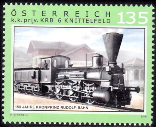 Zum Jubiläum 150 Jahre Kronprinz-Rudolf-Bahn ist in Österreich diese Marke (MiNr 3435) mit der Abbildung der Güterzuglokomotive KRB 6 "Knittelfeld" aus dem Jahre 1868. Im Hintergrund ist auch der Bahnhof Knittelfeld zu sehen.