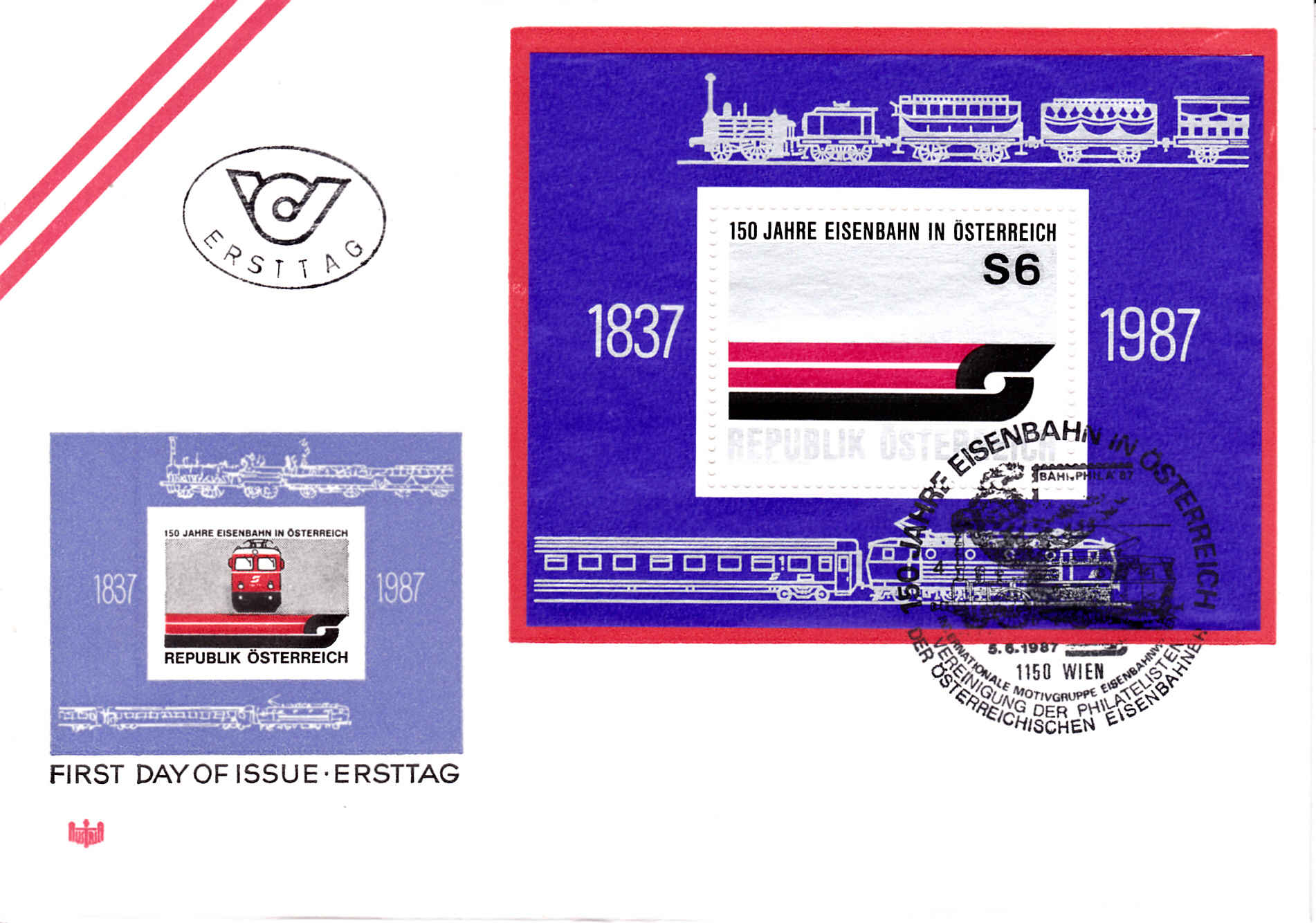 Auf diesem FDC wurde der Block zum 150. Jubiläum der Eisenbahn in Österreich (MiNr Block 9) mit einem zum Thema passenden Sonderstempel aus Wien zur Bahnphila '87 mit der Kennziffer "4".