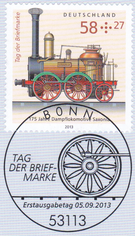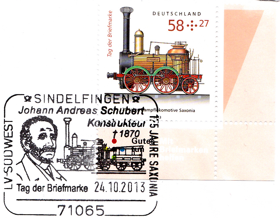 Im Sonderstempel aus Sindelfingen vom 24.10.2013 zum Tag der Briefmarke sind die "Saxonia" und ihr Konstrukteur, Johann Andreas Schubert, abgebildet.