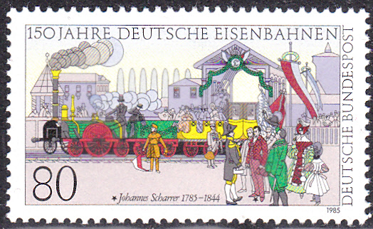 Zum Jubiläum "150 Jahre Deutsche Eisenbahn" erschien bei der Deutschen Bundespost 1985 diese Marke (MiNr 1264) mit einer Darstellung der Ersten Fahrt der "Adler" auf der Strecke von Nürnberg nach Fürth (Ludwigsbahn).