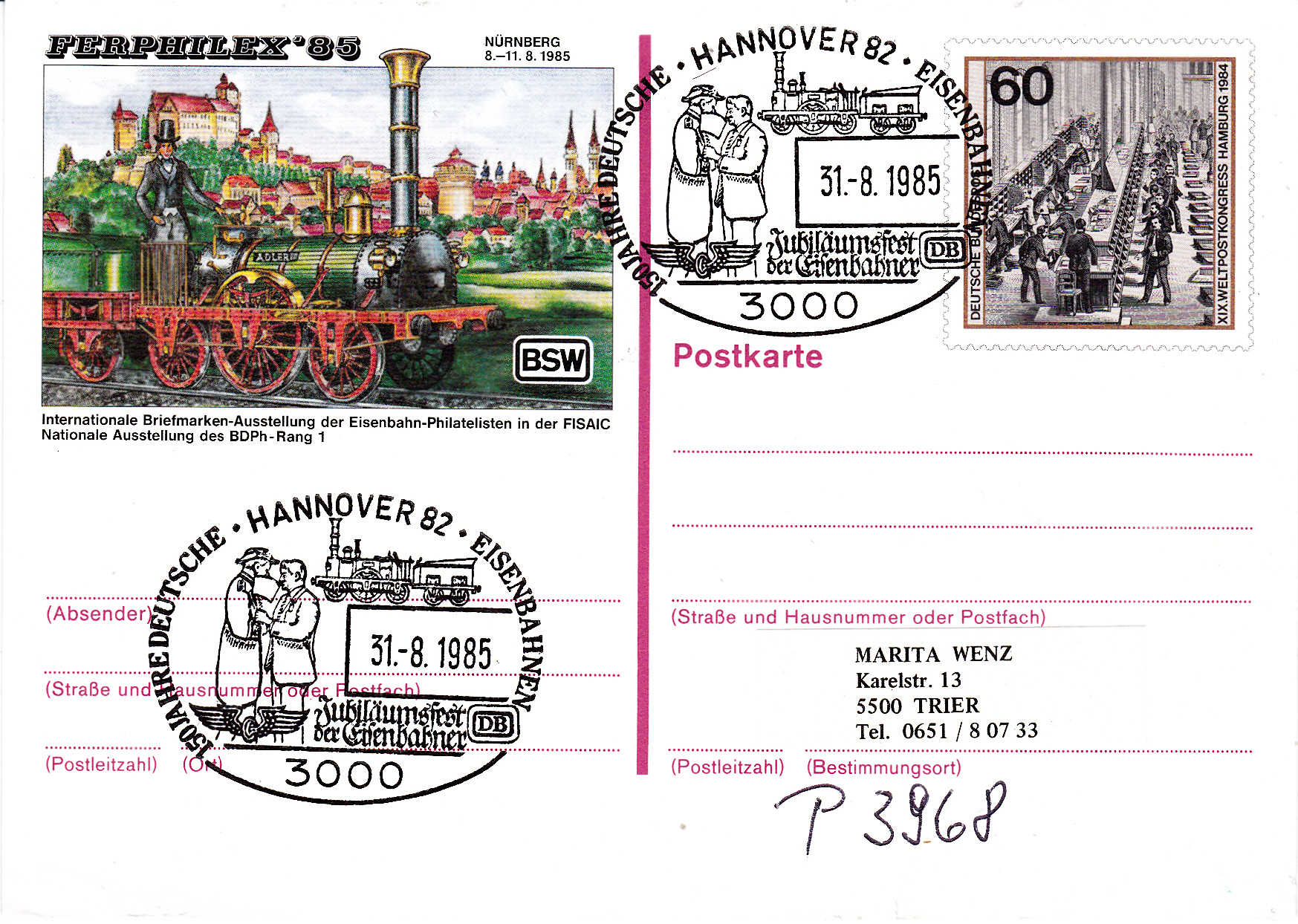 Sonderstempel vom 31.8.1985 aus Hannover zum Jubiläumsfest der Eisenbahner zu "150 Jahre Deutsche Eisenbahn.