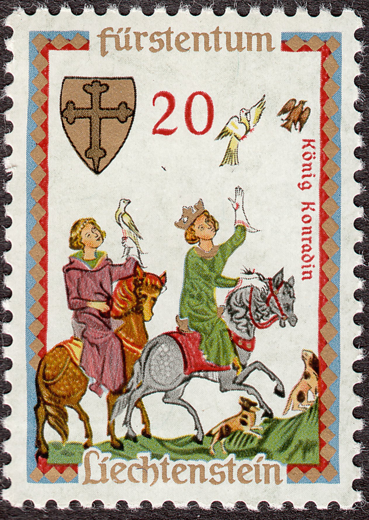 Dieses Postwertzeichen aus dem Fürstentum Liechtenstein gibt das Motiv aus dem Codex Manesse wider: