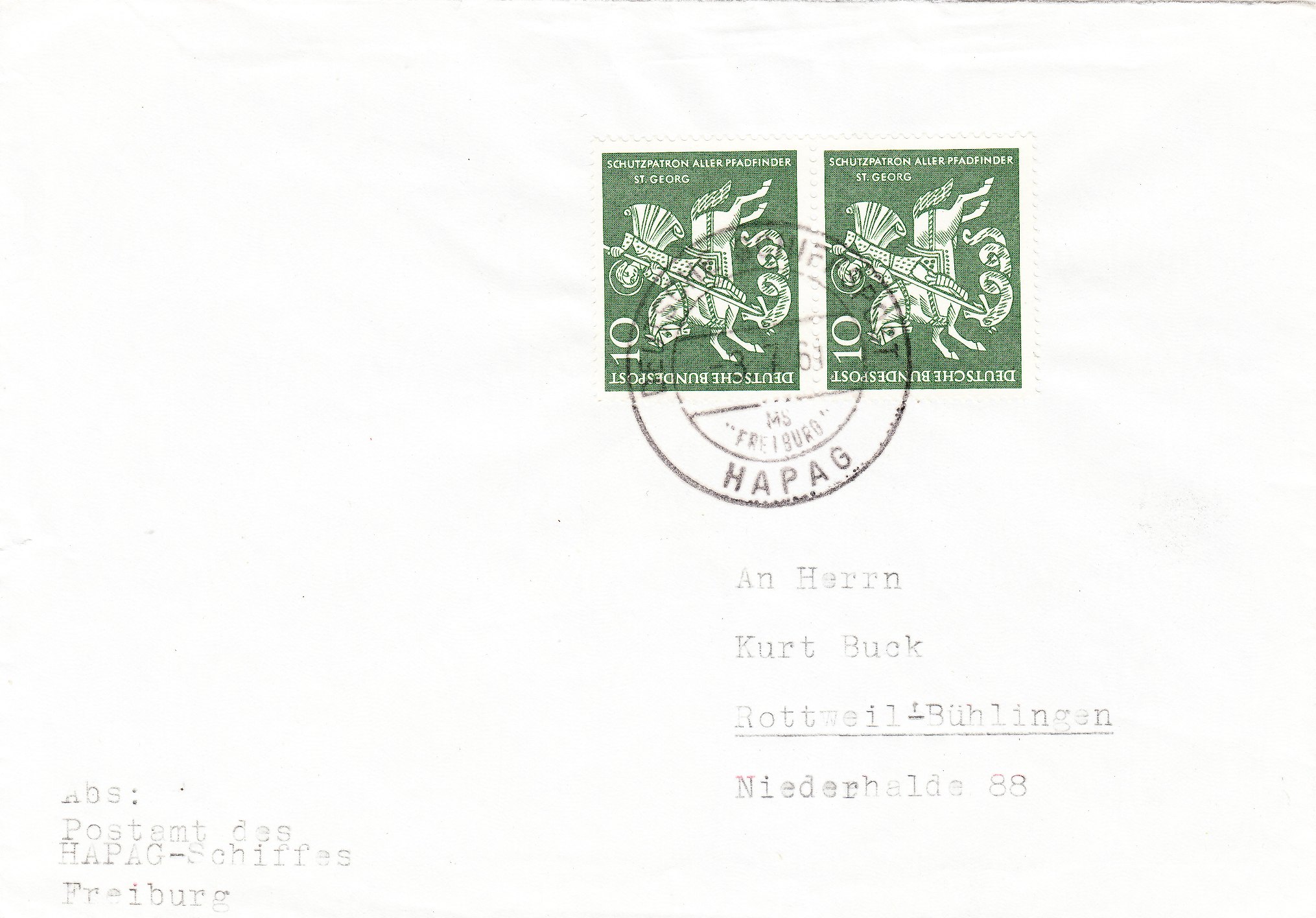 Diese Sondermarke erschien am 22.04.1961, hier als portorichtige Mehrfachfrankatur auf Fernbrief bis 20 g (20 Pfennig), entwertet per Schiffspoststempel auf dem Frachtschiff MS "FREIBURG" der HAPAG (Hamburg-Amerikanische Packetfahrt-Actien-Gesellschaft):