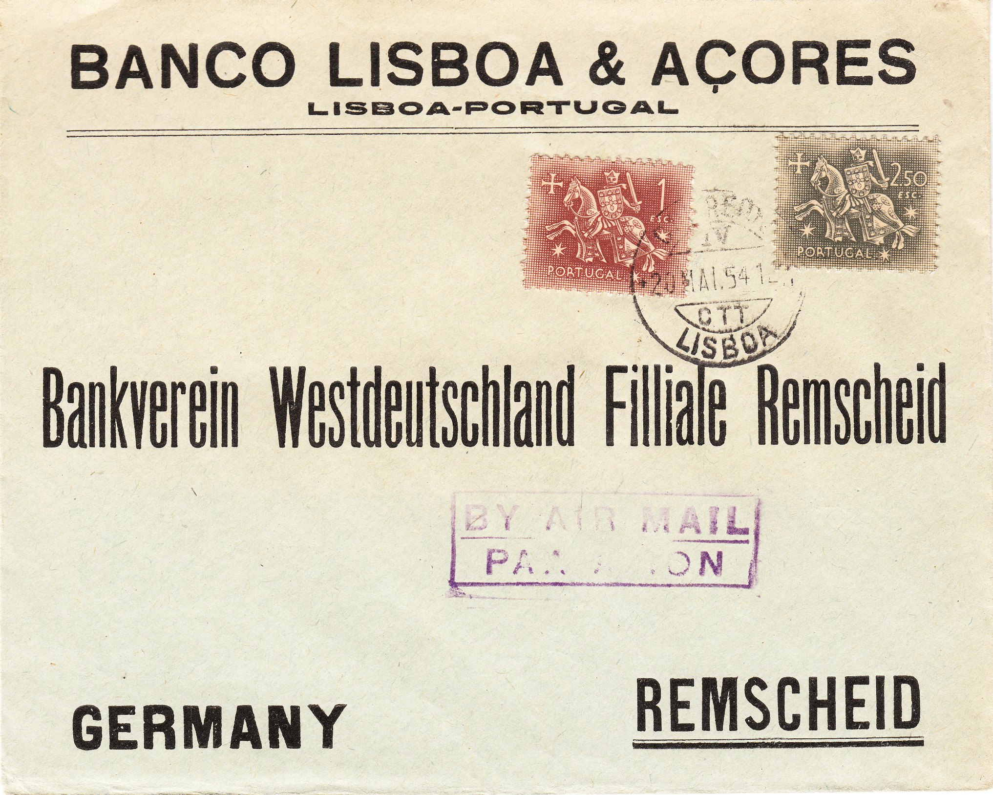 Hier eine Mischfrankatur von zwei Freimarken mit der Darstellung von König Dionysius auf einem Luftpostbrief nach Deutschland am 20.05.1954: