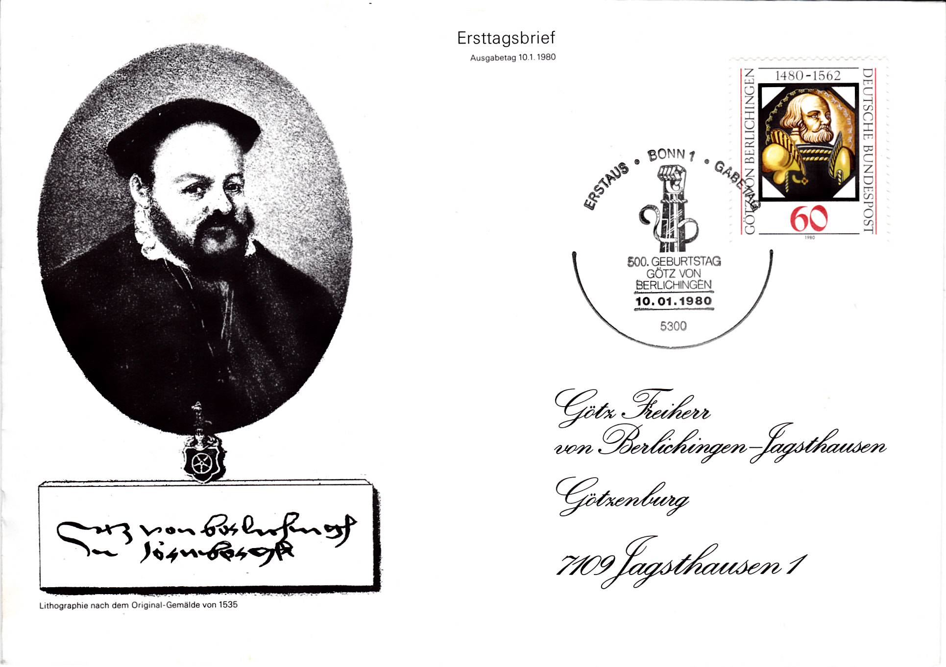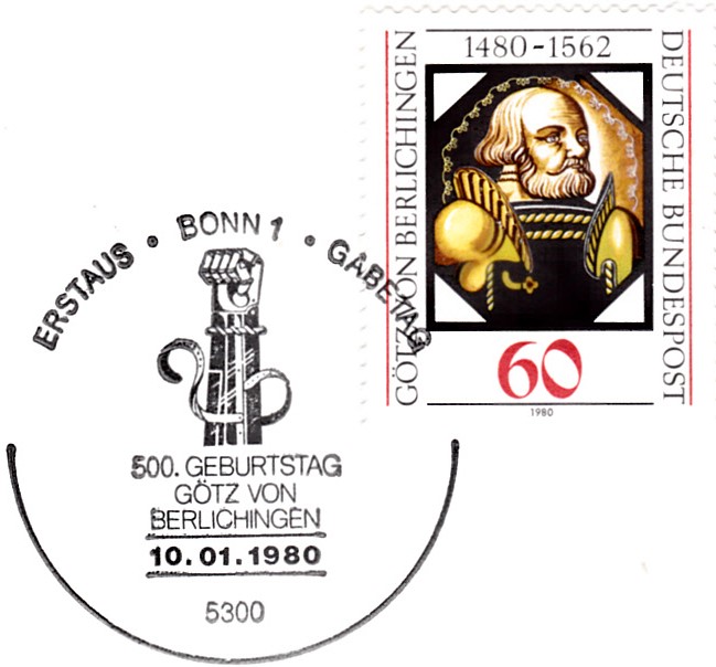 Zum 500. Geburtstag von Götz von Berlichingen ist bei der Deutschen Bundespost auch eine Marke (MiNr 1036) mit der Abbildung von "Götz von Berlichingen" nach einem Glasbild im Schlossmuseum Jagsthausen.
