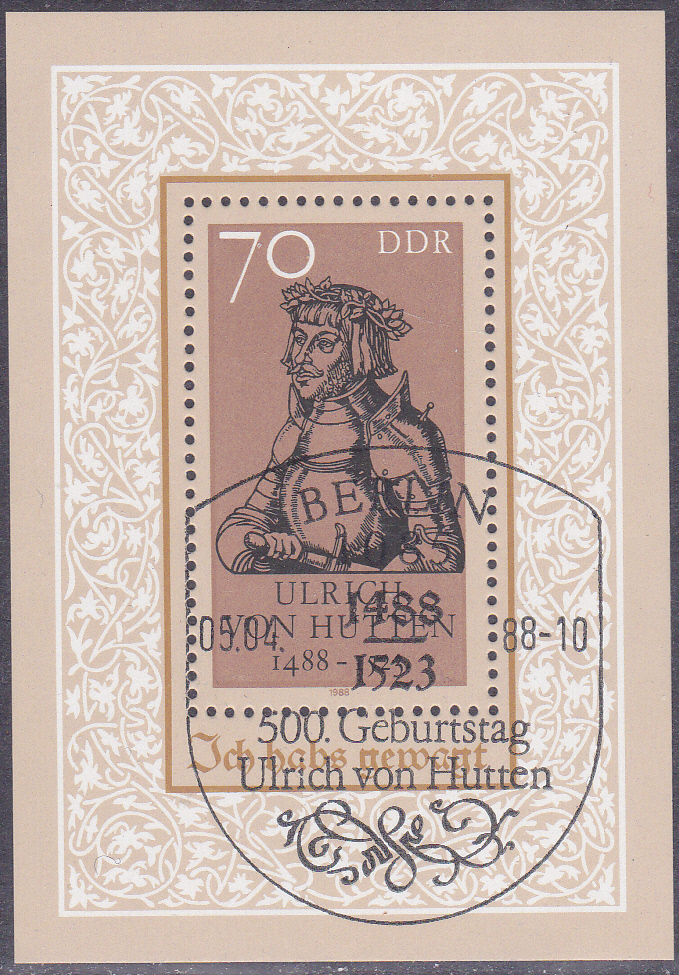 Zum 500. Geburtstag von Ulrich von Hutten ist in der DDR ein Block (MiNr Block 93 mit Marke MiNr 3167) mit einem Porträt von Ulrich von Hutten erschienen.
