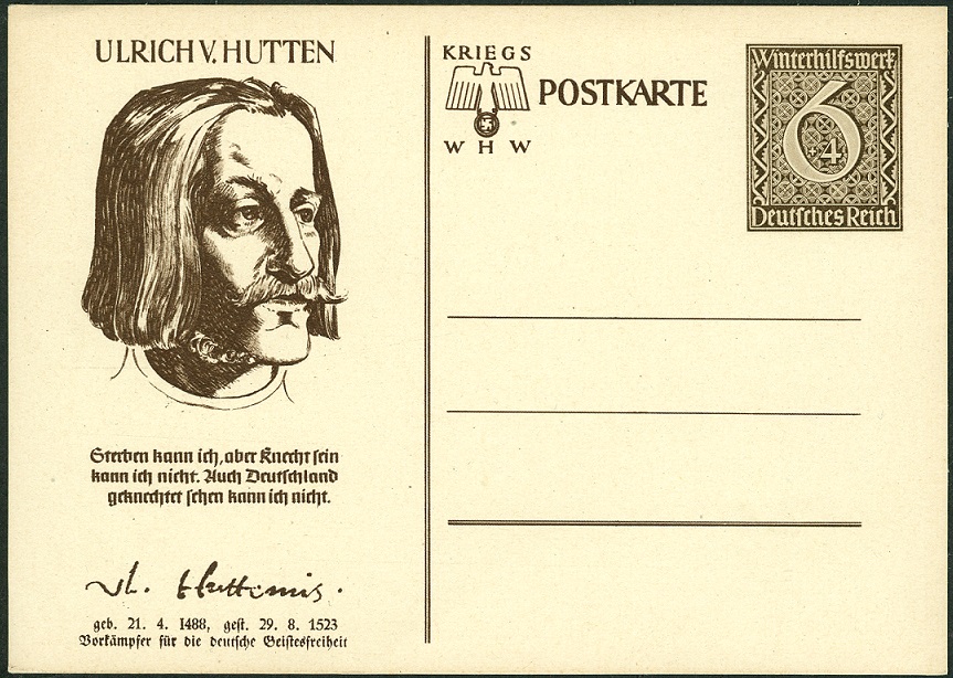 Auf einer Sonderpostkarte aus dem Deutschen Reich (MiNr 285/03) für das Winterhilfswerk 1939 wird auf dem Zudruck Ulrich von Hutten gezeigt.