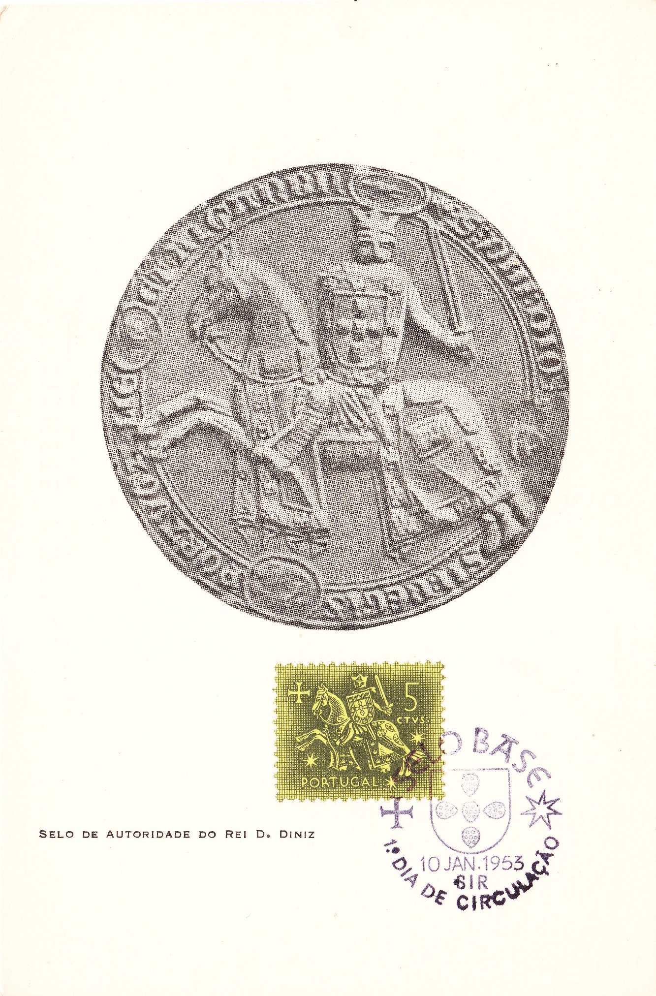 Maximumkarte aus Portugal mit Freimarke zum Thema "Ritter", die als Motiv einen Ausschnitt aus dem auf der Maximumkarte gezeigten Siegel von König Dionysius zeigt: