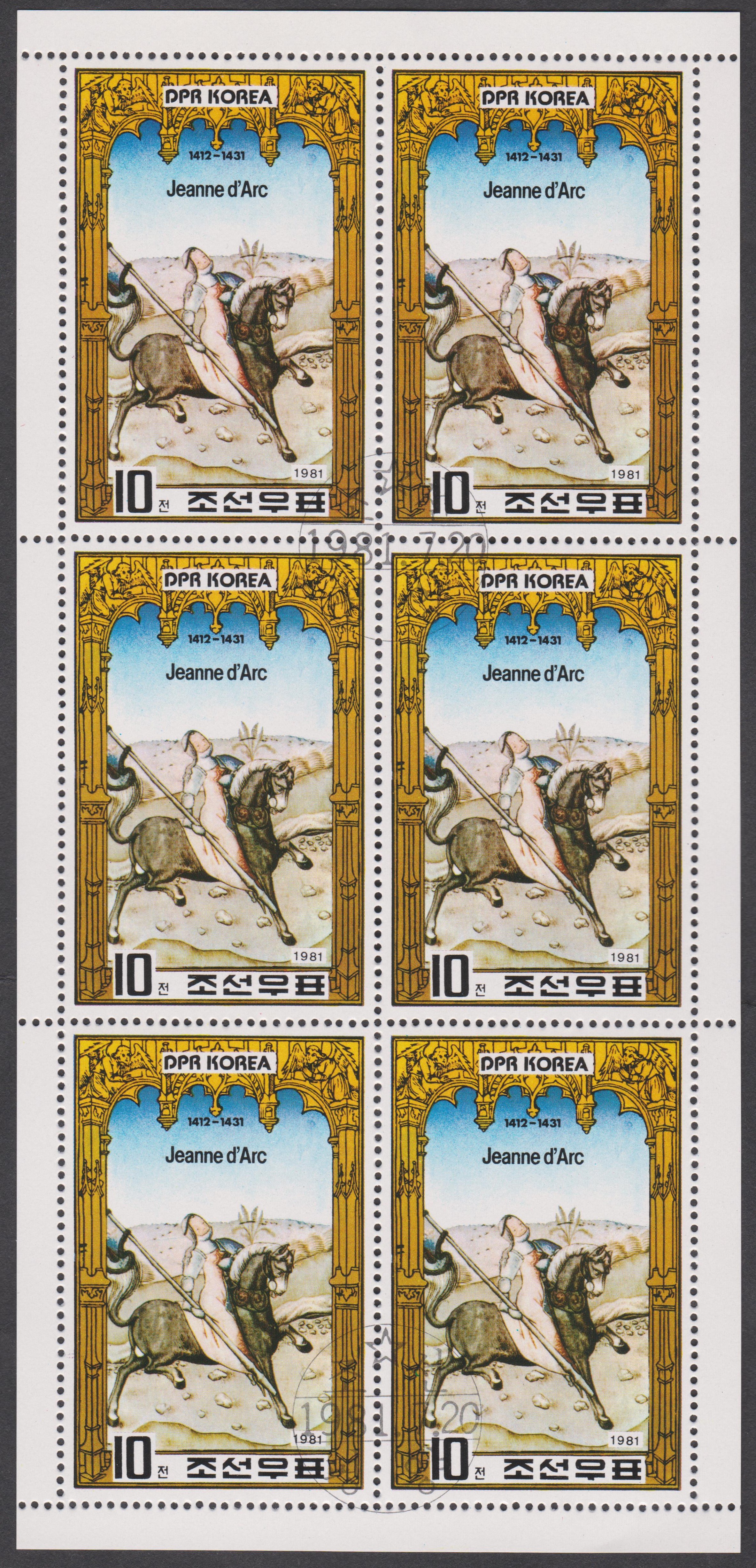 Nordkorea MiNr. 2142 erschien am 20.07.1981 zum 550. Todestag von Jeanne d'Arc im Kleinbogen von 2x3 Marken: