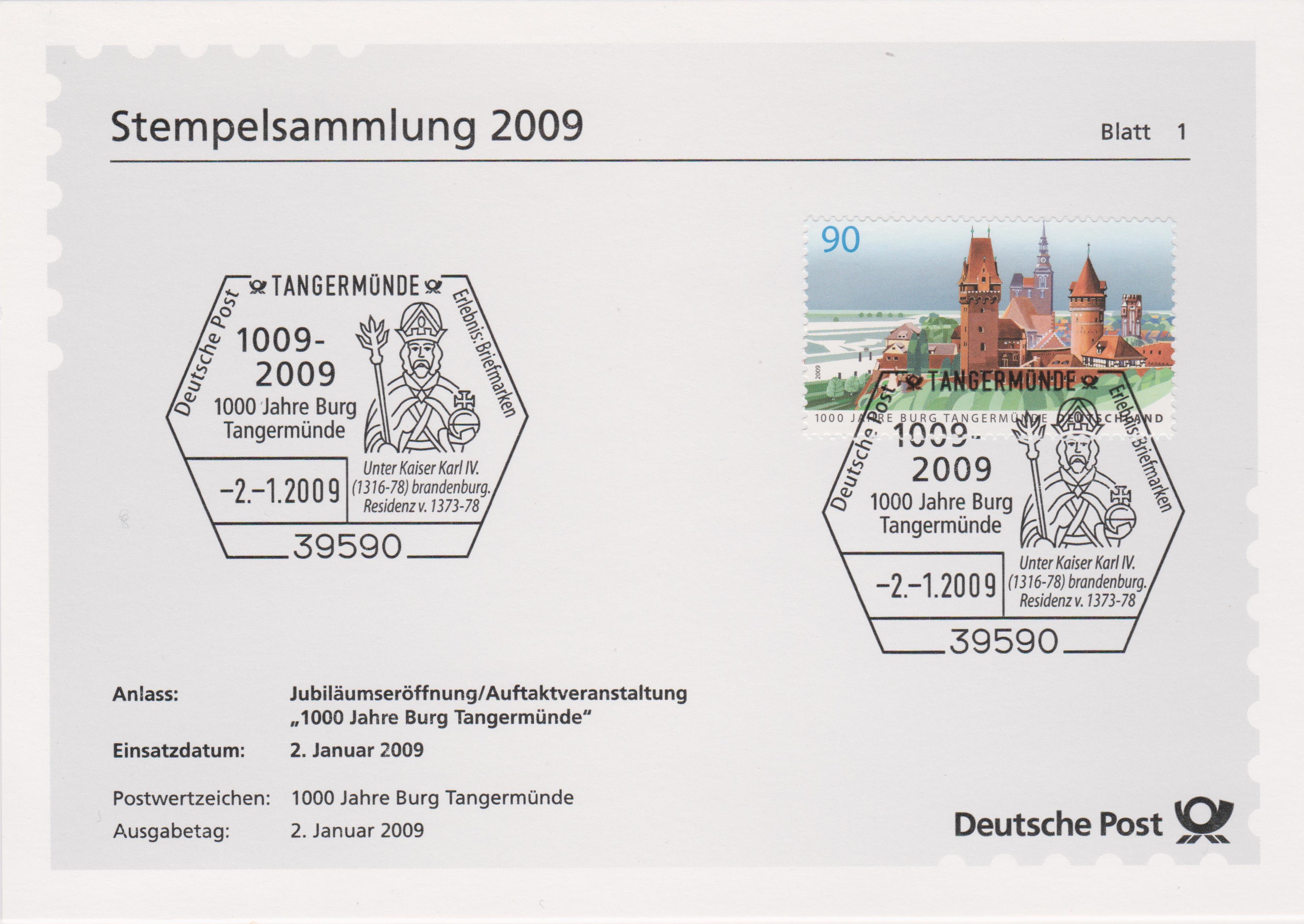 Der Ganzsachenumschlag der Eigenausgabe der Post (MiNr EA F 416) mit dem Vorausentwertungsdatum "-9.-3.2009" zeigt als Wertstempel das Motiv der Marke "1000 Jahre Burg Tangermünde" (MiNr. 2712).