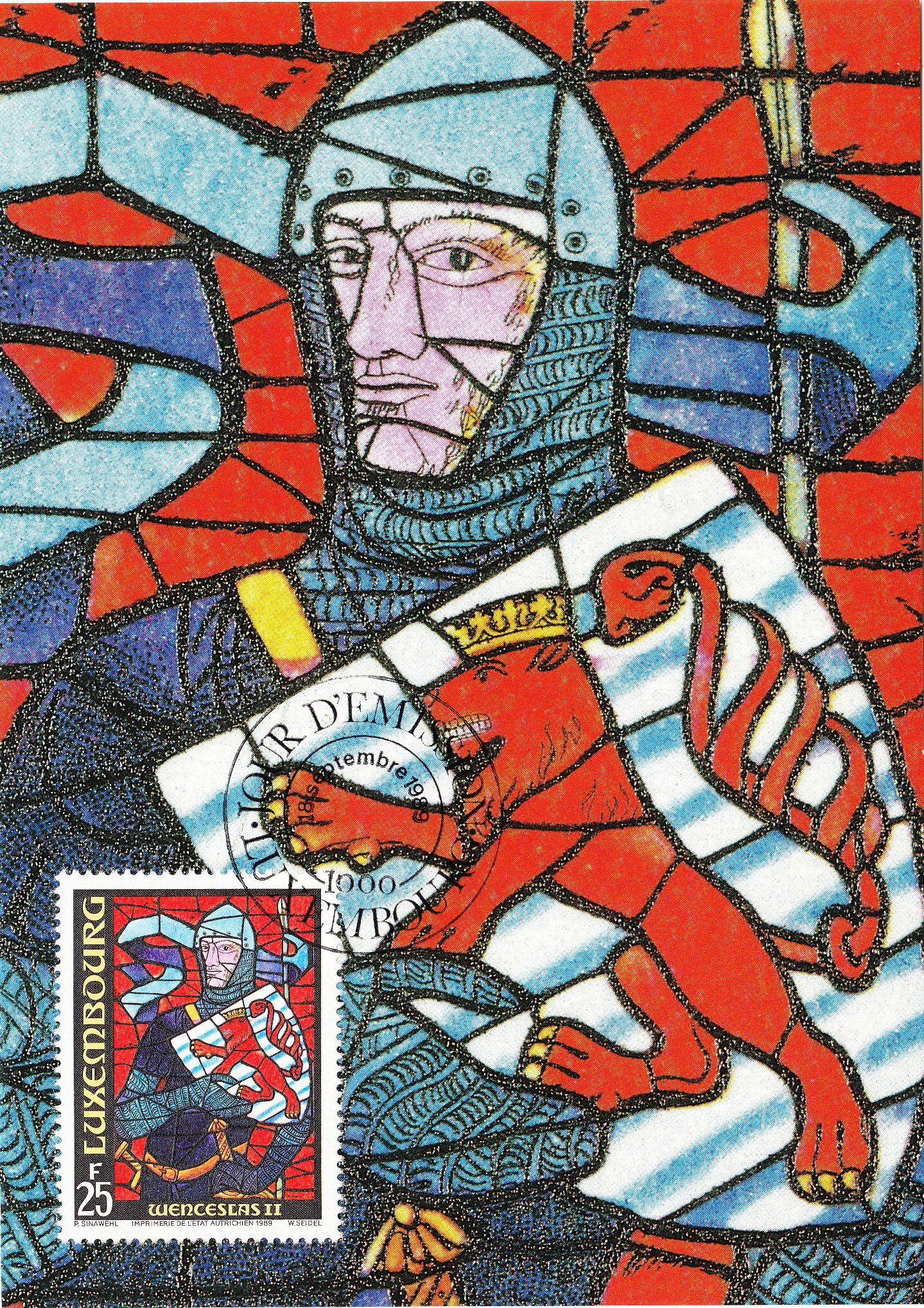 Hier eine Maximumkarte mit einer Marke aus Luxemburg, die Wenzel von Luxemburg als Ritter dargestellt auf einem Kirchenfenster der Kathedrale in Luxemburg zeigt: