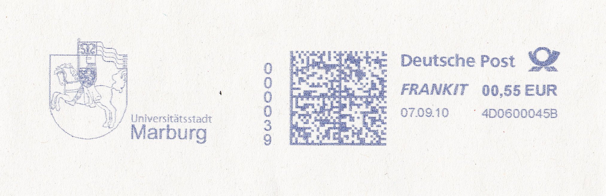 Das heutige Stadtwappen dient einfarbig als Werbeeinsatz in diesem Stempel, der aus einer Frankit-Frankiermaschine stammt: