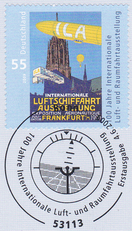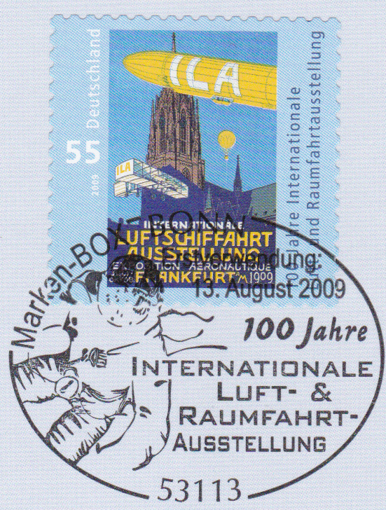 Zum Jubiläum 100 Jahre Internationale Luft- und Raumfahrtausstellung erschien bei der Deutschen Post eine Marke (MiNr 2740) mit dem Plakat der ersten Ausstellung in Frankfurt am Main im Jahre 1909.