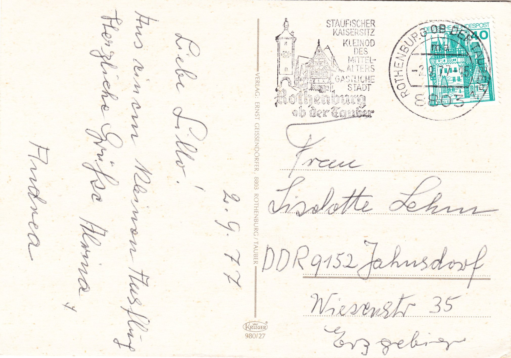 Dieser Maschinenstempel zeigt einen Ausschnitt des wohl häufigsten Fotomotivs in Rothenburg ob der Tauber: "das Plönlein":
