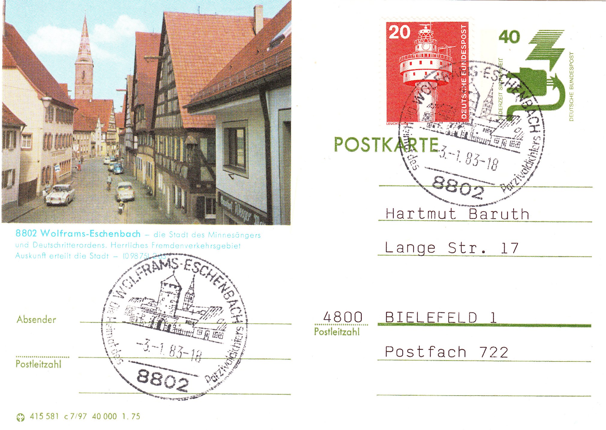 Diese Bildganzsache wurde am 03.01.1983 in Wolframs-Eschenbach mit einem thematisch passenden Handwerbestempel entwertet "Die Heimat des Parzivaldichters":