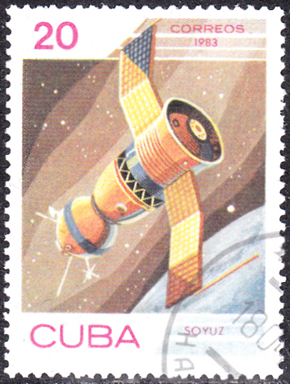 Zum "Tag der Raumfahrt" 1983 wurde in Kuba diese Marke (MiNr 2735) mit der Abbildung eines Sojus-Raumschiffes herausgegeben.