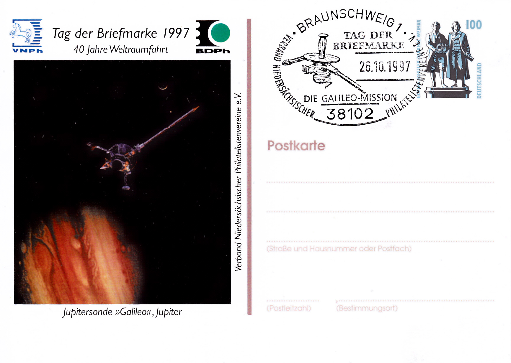 Auf der Ganzsachen-Postkarte des Verbandes Niedersächsischer Philatelistenvereine e.V. und im Stempel zum Tag der Briefmarke 1997 vom 26.10.1997 ist die Jupitersonde "Galileo" abgebildet.
