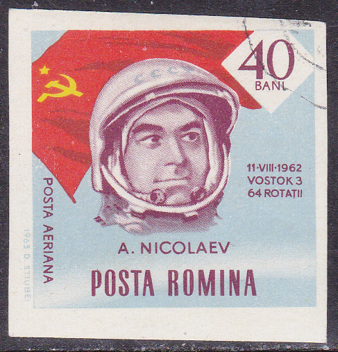 Die hier schon vorher gezeigte Marke aus Rumänien (MiNr 2242) mit dem Kosmonauten A. G. Nikolajew wurde auch als geschnittene Marke (MiNr 2252) in etwas anderen Farben verausgabt.