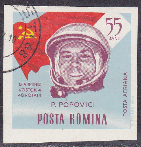 Die hier schon vorher gezeigte Marke aus Rumänien (MiNr 2243) mit dem Kosmonauten P. R. Popowitsch wurde auch als geschnittene Marke (MiNr 2253) in etwas anderen Farben verausgabt.