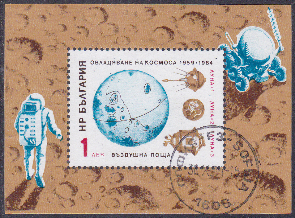 Zum 25. Jahrestag des Starts der ersten Mondsonde ist in Bulgarien ein Block (MiNr Block 147 mit Marke MiNr 3301) erschienen. Auf der Marke sehen wir auf der rechten Seite Luna 1, Luna 2 und Luna 3.