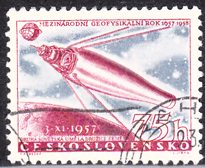 Eine Marke aus der Serie der Tschechoslowakei (MiNr 1057) zum "Internationales Geophysikalisches Jahr 1957/58" zeigt Sputnik 2 in der Erdumlaufbahn.