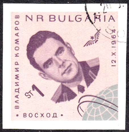 Auf dieser Marke aus einer Serie der Sowjetunion (MiNr 2968) wird die komplette Mannschaft von Woschod 1 gezeigt.