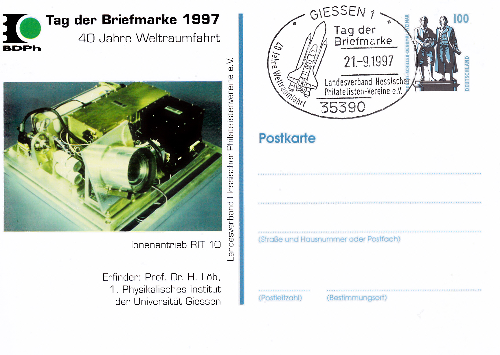 Der Philatelistenverband Mittelrhein e.V. zeigt auf der Ganzsachenkarte zum Tag der Briefmarke 1997 die Weltraumrakete "Columbus" mit einem Space Shuttle und im Sonderstempel vom 19.10.1997 aus Hennef ein Space Shuttle.