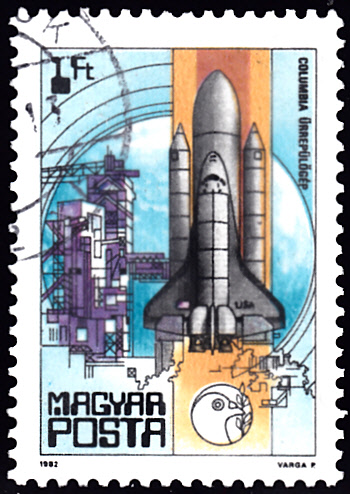 Auf einer Marke (MiNr 3557 A) einer Serie "25 Jahre Weltraumfahrt" aus Ungarn ist die "Columbia" als erste wieder verwendbare Raumfähre abgebildet.