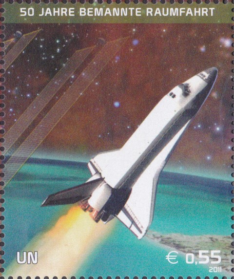 Zum Jubiläum "50 Jahre bemannte Weltraumfahrt" ist bei der Postverwaltung der UNO Wien diese Marke (MiNr 715) mit einer Abbildung einer Amerikanischen Raumfähre Space Shuttle erschienen.