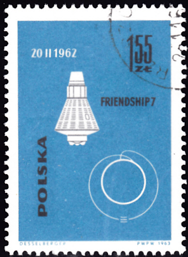 Auf einer Marke aus Polen (MiNr 1443) aus einer Serie "Eroberung des Weltraums" werden Skizzen der Mercury-Kapsel "Friendship 7" und ihrer Flugbahn gezeigt.