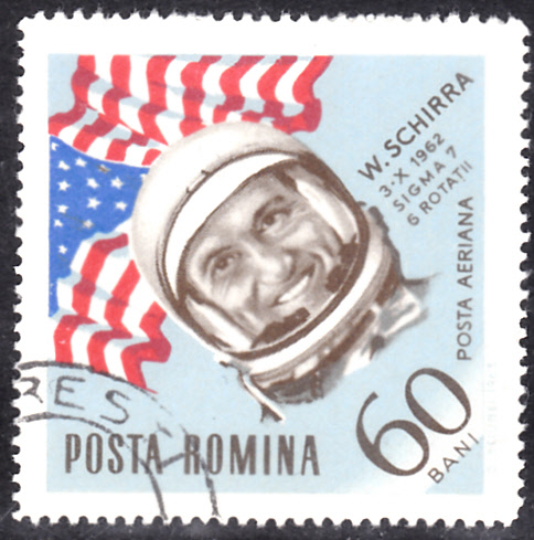Ebenfalls in der gleichen Serie "Weltraumfahrt" ist in Rumänien auch diese Marke (MiNr 2244) mit dem Porträt von Walter Schirra erschienen.