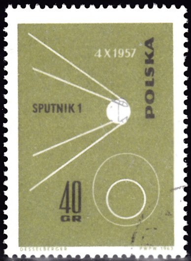 Auf einer Marke aus Polen (MiNr 1438) aus einer Serie "Eroberung des Weltraums" sind Skizzen von Sputnik 1 und seiner Flugbahn zu sehen.